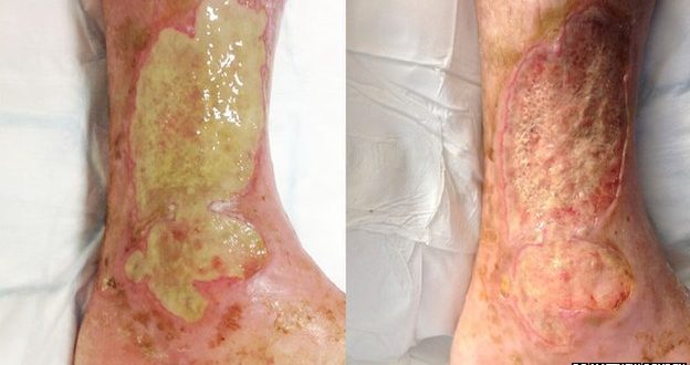 المصاب فى الحرب (س) عمره 35 عاماً عنده ندبة كبيرة فى ظهر قدمه اليمني، وفى وسط الندبة قرحه مساحتها 3×5 سم2 وقاعها عميق رمادي لامع وحروفها كثيفة ميتة، وقد قال المريض: إن الجرح ظل على هذه الحالة مدة ثلاثة أشهر، وباستعمال مرهم (فيشنفسكي) والعلاج بالأشعة وغيرهما من الطرق لم تجد نفعاً وبمضي 22يوماً بعلاجه بمرهم العسل شفيت القرحة تماماً.