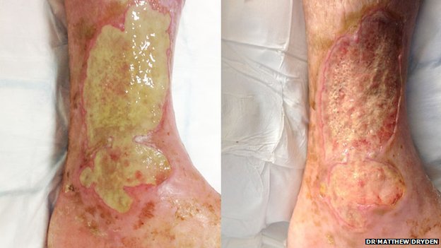 وقد بدأت مع مساعدي بتطبيق ضمادات العسل، واقتنعنا بفائدتها رغم أننا طنا فى شك كبير فى ذلك. إن تأثير العسل القاتل للجراثيم عند تطبيقه على التقرحات والسطوح الملتهبة أكيد لا شك فيه وذلك بسبب فعله الماص للماء بصورة خاصة ويظهر فعله هذا بعد تطبيقه بوقت قصير على السطح المتعري وذلك بسيلان اللمف الحر الحاصل وإن سرعة نظافة المناطق الملتهبة ملحوظة غالباً، كما أُزيلت القشور والبثرات بصورة أسرع مما هو عليه فى الأحوال العادية عند استعمال الأدوية الأخرى.