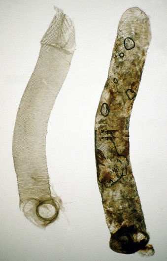 ^BMite-infested trachea.^b Light micrograph of normal (left) and infected (right) tracheae (airways) from a honeybee (^IApis mellifera^i). The trachea at right is infested with honeybee tracheal mites (^IAcarapis woodi^i). Mites are related to spiders, and many are parasites of other animals. These mites cause a condition known as acariosis or acarine disease. It makes the bees lethargic and unable to fly, and can cause entire honeybee colonies to collapse. Pairs of tracheae are located in the thorax and abdomen of honeybees. They form the respiratory system by which gases diffuse into and out of the honeybee's tissues.